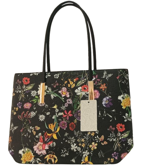 Este bolso shopper es una declaración de estilo por sí mismo. Con un elegante fondo negro que resalta un vibrante estampado floral multicolor, combina a la perfección sofisticación y alegría. Su tamaño amplio lo convierte en el compañero ideal para el día a día, permitiéndote llevar todo lo que necesitas con comodidad. Las asas largas y rígidas en tono negro permiten llevarlo al hombro o en la mano, mientras que los detalles metálicos dorados aportan un toque de distinción. Un bolso práctico, con carácter, perfecto para quienes buscan destacar con elegancia.Bolso shopper con estampado floral sobre fondo negro, asas largas y detalles metálicos dorados. Un diseño llamativo y versátil para tu día a día