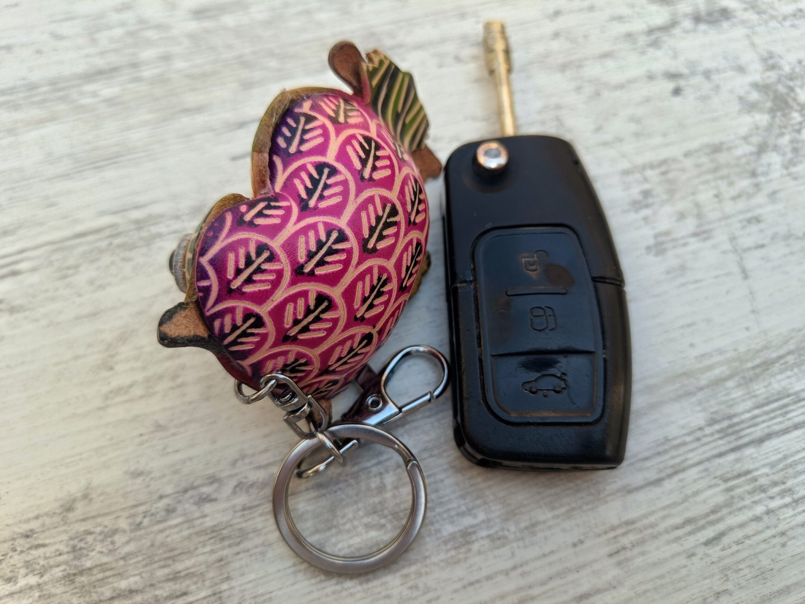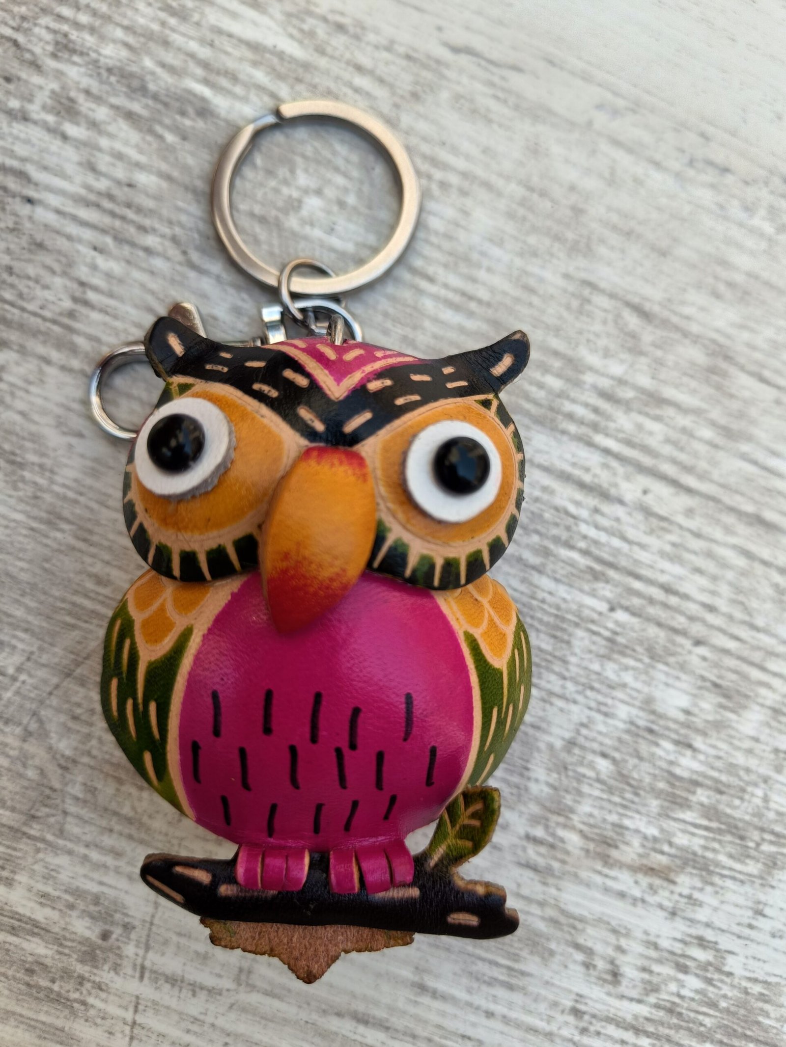 Dale un toque de color y personalidad a tu día a día con este encantador llavero artesanal en forma de búho. Elaborado en cuero y pintado a mano con vivos tonos fucsia, naranja, verde y negro, cada detalle resalta la mirada curiosa de este simpático búho. Su diseño único y alegre convierte este llavero en un accesorio práctico y decorativo, ideal para regalar o coleccionar. Perfecto para darle vida a tus llaves, mochila o bolso, llevando contigo un pequeño recordatorio de creatividad y originalidad.