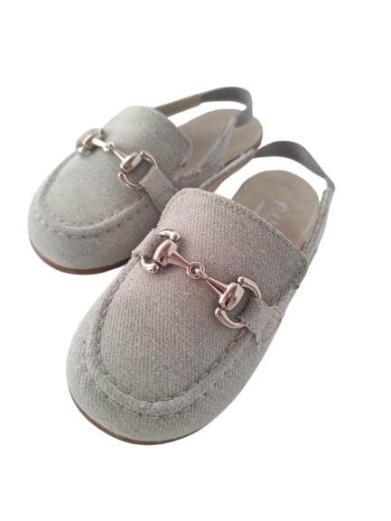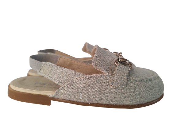 «Este mocasín infantil, confeccionado en tela vaquera, combina diseño clásico y funcionalidad para los más pequeños. Su suave acabado asegura comodidad durante todo el día, mientras que el elegante detalle metálico tipo estribo aporta un toque sofisticado. La tira trasera elástica ofrece un ajuste firme y práctico, facilitando que el zapato se mantenga bien sujeto sin perder libertad de movimiento. Ideal para completar looks informales o más arreglados con un calzado versátil y atemporal.»