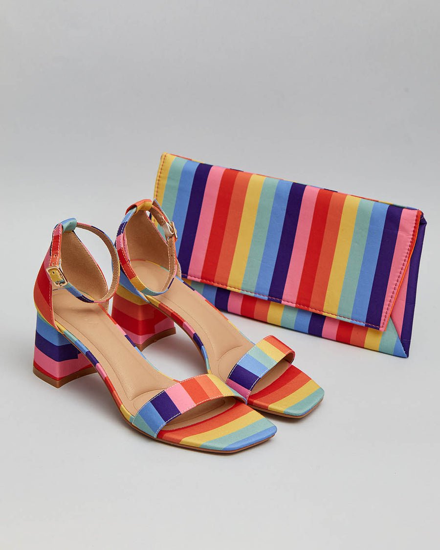 Sandalia de tacón medio y bolso tipo sobre a juego, con estampado de rayas multicolor. Un dúo alegre y vibrante para darle color a tu look