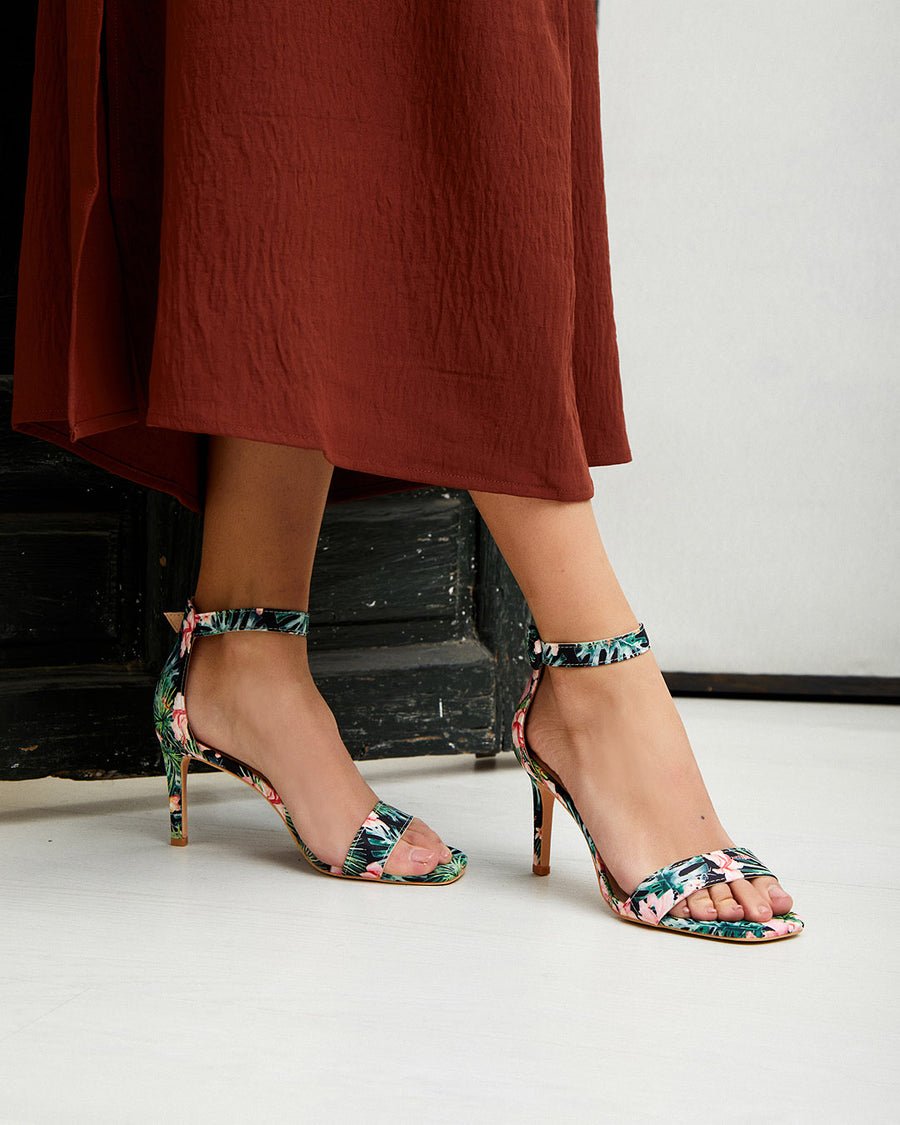 Sandalias de tacón con estampado tropical y pulsera al tobillo, ideales para dar un toque fresco y veraniego a cualquier look.