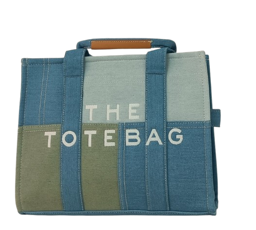 bolso tipo tote hecho en tejido tipo denim con un diseño patchwork en tonos azules, verde oliva y celeste. Lleva la inscripción «THE TOTE BAG» en letras blancas en la parte frontal. Tiene doble asa de mano con una pieza superior en marrón tipo piel que recubre la unión para mayor comodidad. Su estructura es rígida y rectangular, lo que le da cuerpo y forma definida.
